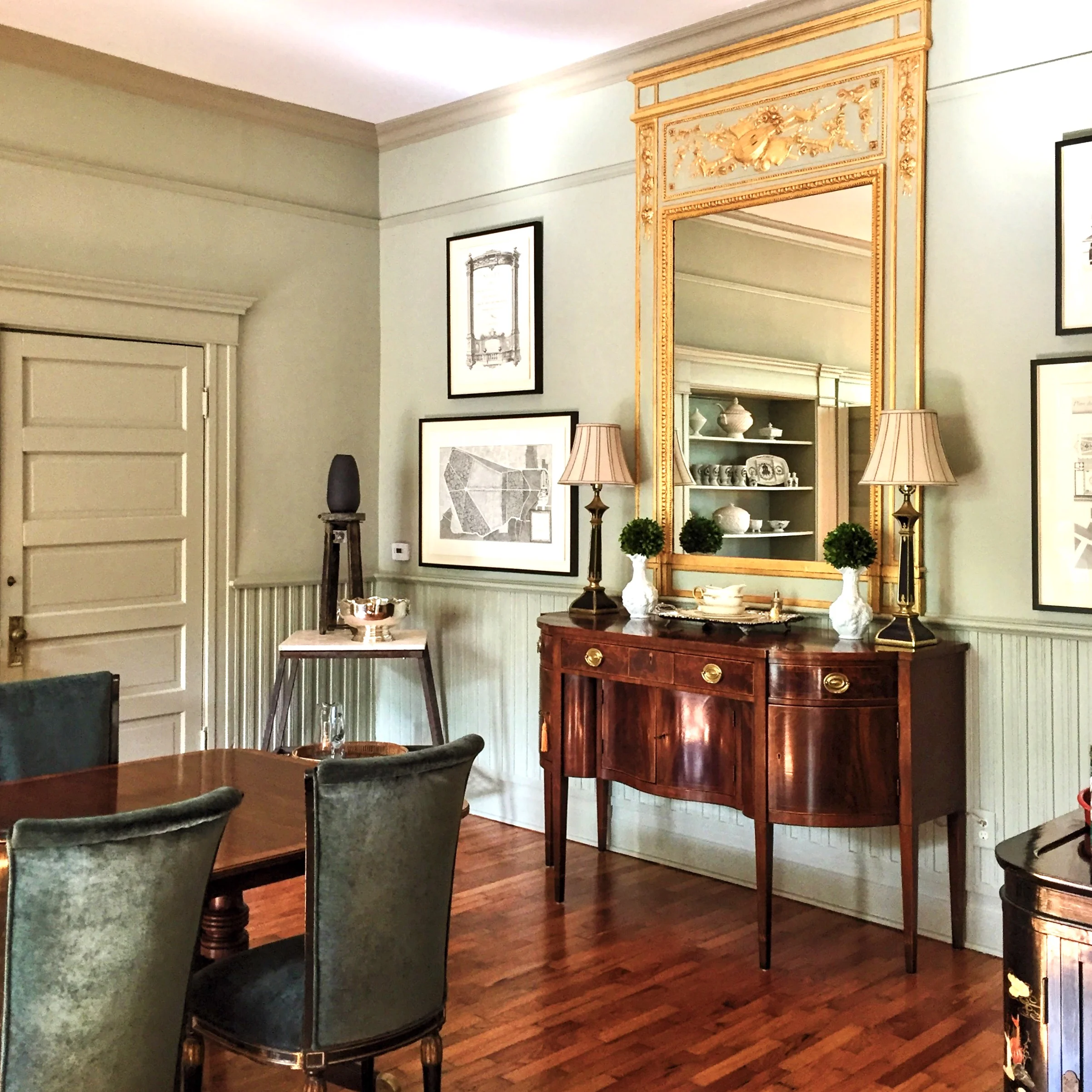 In order to achieve that look without paying $100k to import boiserie, we transformed a grand scale trumeau and trimmed it to fit exactly in the space as a boiserie trumeau would. Tonal shifts between Farrow and Ball French Grey and Light Grey create depth while working an overall tone. The chairs, 1950's Maison Jansen, were an incredible find at auction. They were reupholstered to blend with the tone on tone effect of the room.